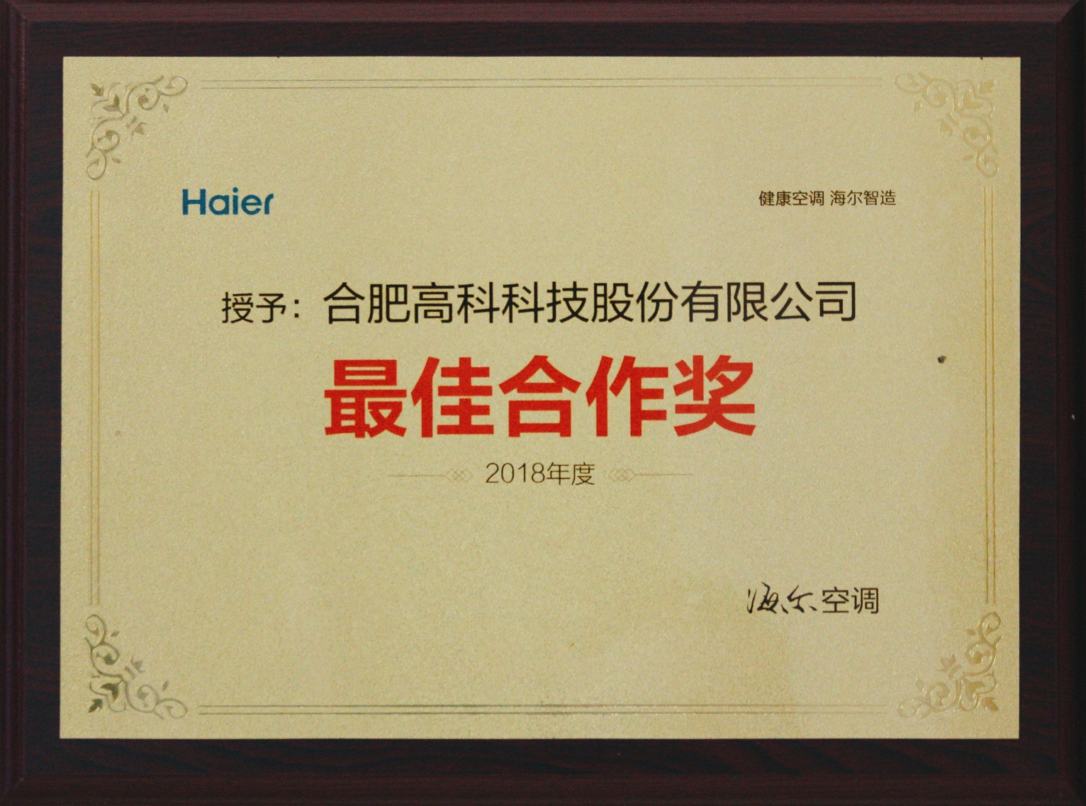 2018合肥海爾最佳合作獎(jiǎng)