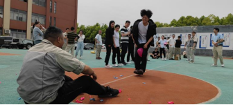 第二項進行的是“合力吹氣球”,共有六組參加,每組4人,每個人分工不同,吹、扎、運、破,完整的運送5個氣球并用屁股坐破所用的時間最短為獲勝。這個項目不僅考驗體力活、手工活,還考驗足夠強大的肺活量。