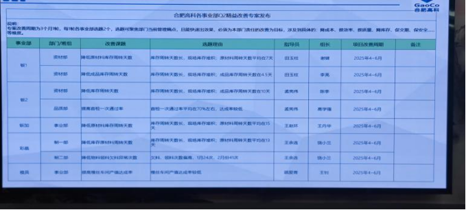 為深化精益理念,合肥高科創新推出“C2精益改善專家”機制,以事業部為單位,圍繞“降成本、提效率、提質量、降庫存、促交期、保安全”六大目標,制定可量化、可追蹤的改善課題。各事業部分別上臺匯報2025年第一季度精益改善專案的成果。